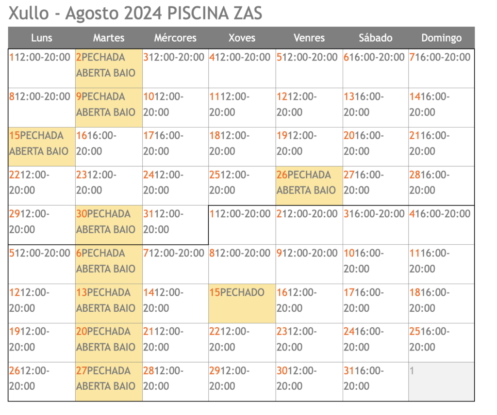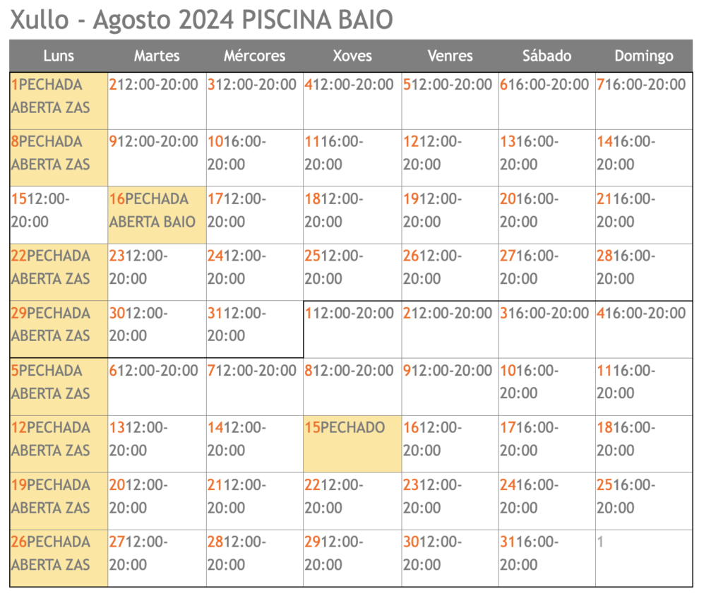 A continuación podes consultar o calendario de apertura da piscina municipal de Zas e da piscina municipal de Baio.