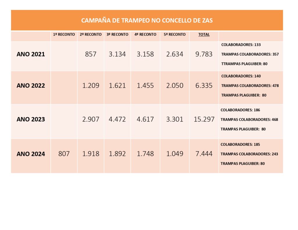 Este é o oitavo ano que o Concello de Zas pon en marcha unha campaña de trampeo que se prolonga ata o mes de maio, sendo así un dos primeiros municipios da zona en loitar contra esta praga que afecta a toda a comunidade. Segundo os datos recollidos ano a ano, no 2023 houbo un claro repunte do número de vespas atrapadas cun total de 15.297 capturas. Segundo explicou Isidro Rodríguez, responsable da empresa encargada da campaña (Plaguiber), prevese que este ano haxa un novo repunte de capturas xa que “as temperaturas do inverno foron suaves e déronse as condicións ideias para que as raíñas sobreviviran”. É precisamente nestes meses, febreiro e marzo, o momento ideal para a instalación de trampas para capturar o maior número de raíñas posibles que están a despertar do seu letargo. “Cantas máis raíñas se capturen máis niños primarios se evitarán”, sinalou o responsable de Plaguiber.